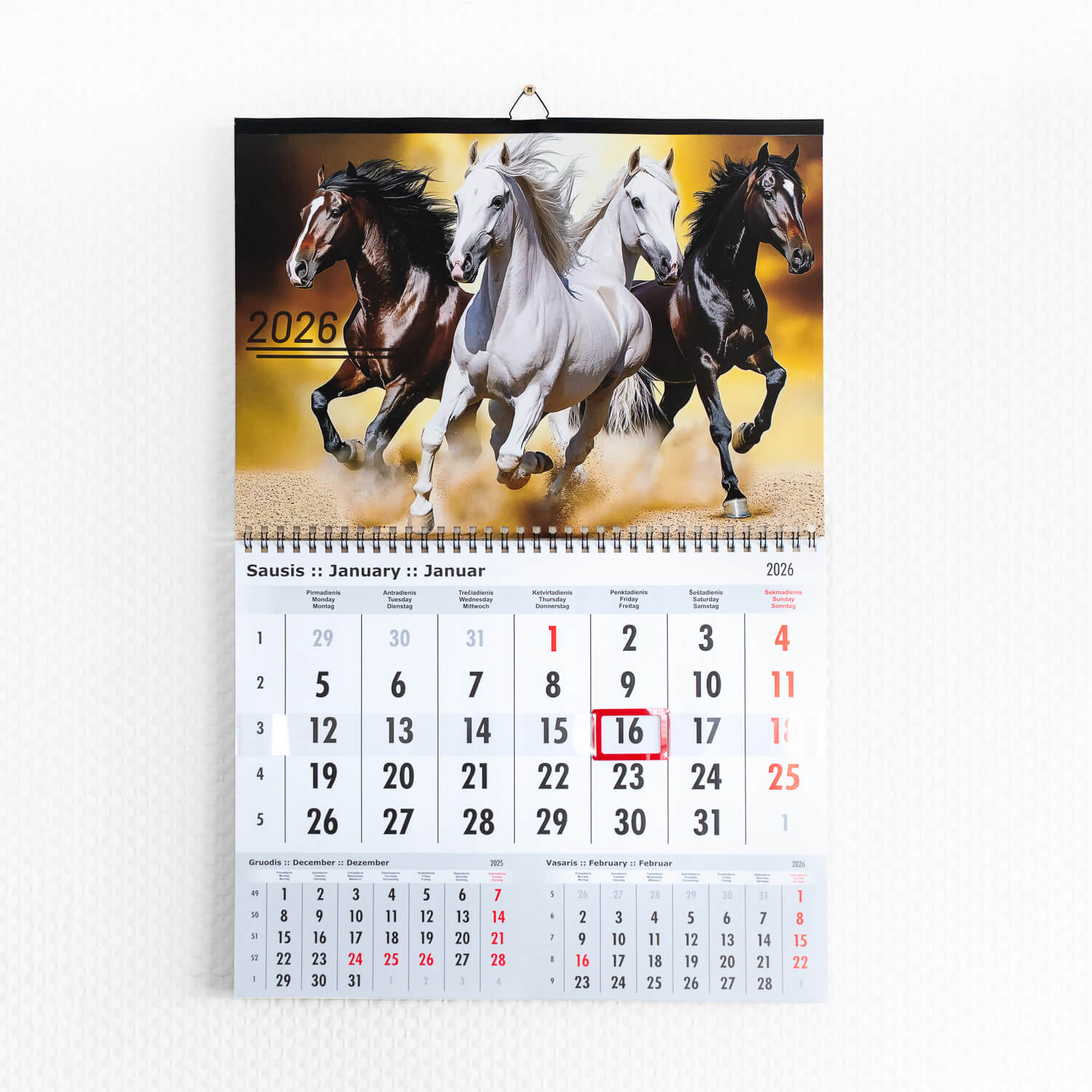 Spiralė, metalinė pakabinimo kilpelė, metalinė juostelė apačioje ir viršuje, dienų žymeklis (slankiojantis langelis).