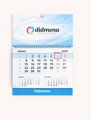 Spiralė, metalinė pakabinimo kilpelė, metalinė juostelė apačioje ir viršuje, dienų žymeklis (slankiojantis langelis).